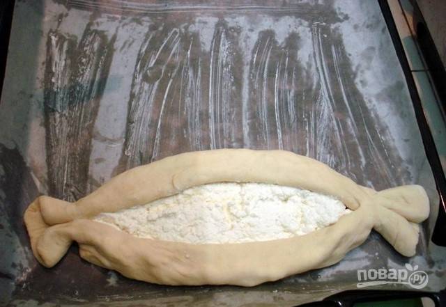 Затем тесто сверните с двух противоположных сторон и соедините их между собой с других.