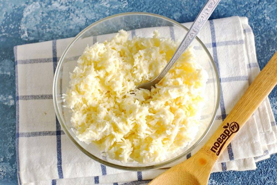 Сыр натрите на мелкой терке и разомните вилкой с мягким сливочным маслом. Можно добавить немного соли по вкусу.
