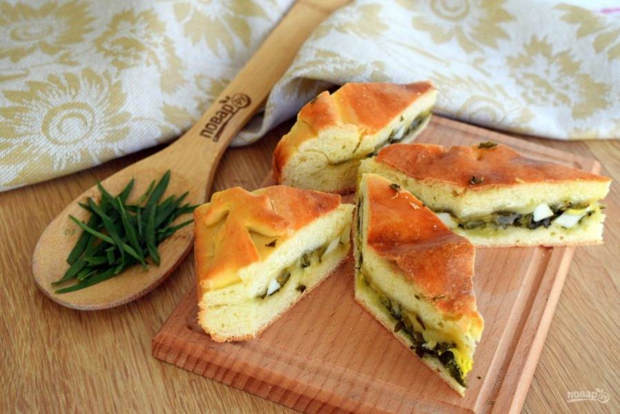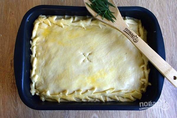 Распределите начинку по всей поверхности пирога. Оставшееся тесто раскатайте в тонкий пласт и накройте начинку, прижмите края, обрежьте лишнее тесто. Из его остатков можно вылепить украшения. В центре пирога ножом сделайте небольшие насечки.