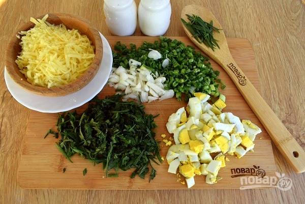 В это время приготовьте начинку. Листья тархуна и зеленый лук измельчите. Яйца очистите и крупно нарежьте. Сыр натрите на крупной терке. На сковороде растопите масло, пассеруйте зеленый лук в течение 1-2 минут. Перемешайте все ингредиенты для начинки, посолите и поперчите по вкусу, остудите.