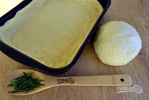 Тесто разделите на 2 части раскатайте в тонкий пласт по размеру вашей формы (противня) для запекания. Форму слегка смажьте маслом. Распределите один пласт теста по всей форме, формируя низенькие бортики.