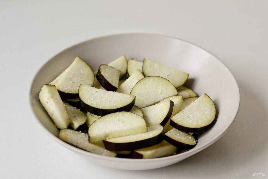 Баклажан помойте, затем нарежьте кружочками по полсантиметра. Затем каждый кружок разрежьте еще пополам. Посолите и оставьте на 30 минут.