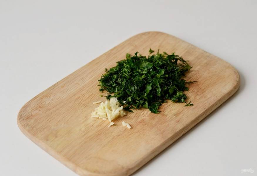 Мелко порубите очищенный чеснок и зелень ножом.