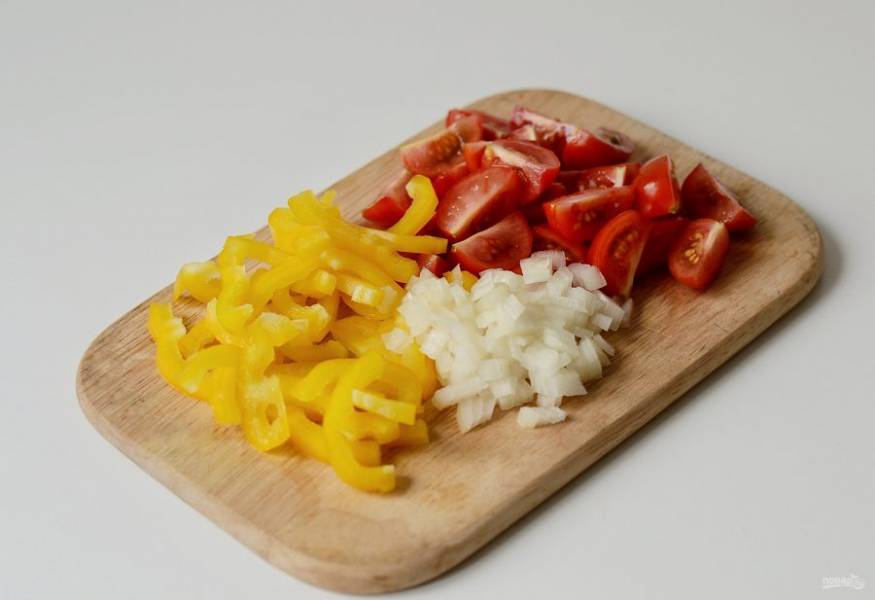 Помидоры черри нарежьте четвертинками, болгарский перец полукольцами, лук порубите кубиками.