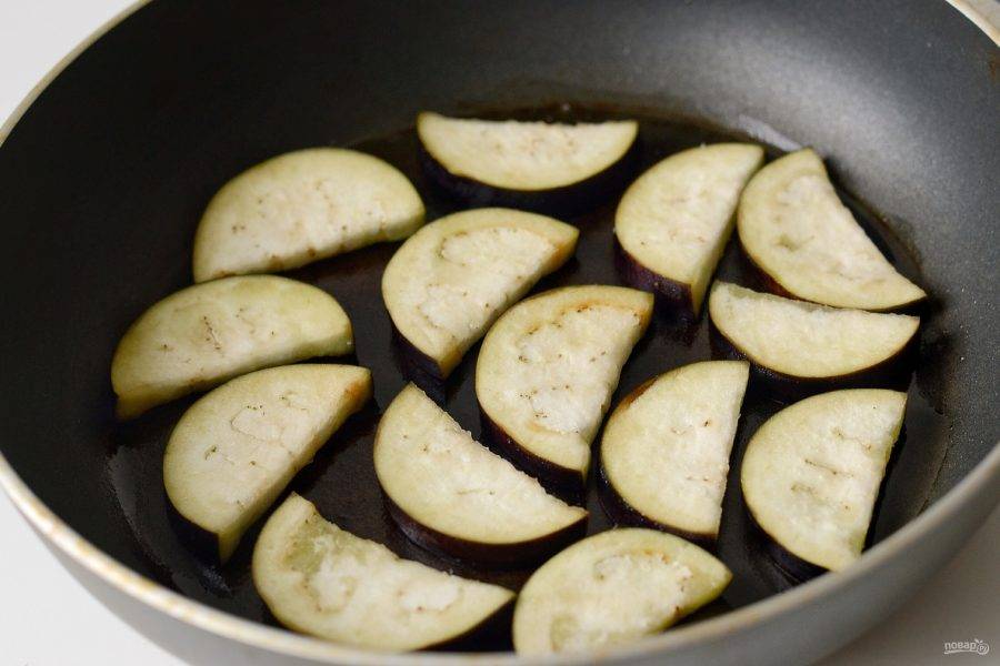 Разогрейте сковороду с маслом, выложите баклажаны в один слой. Обжарьте с двух сторон до румяного цвета. Затем переложите на бумажное полотенце, чтобы впиталось лишнее масло.