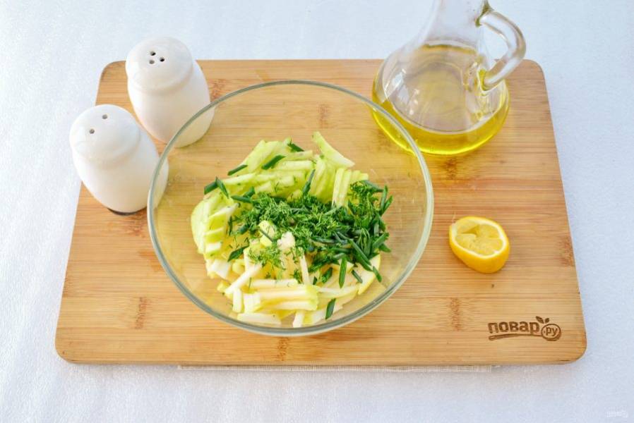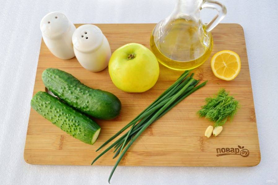 Огурец, яблоко и чеснок натрите на крупной терке или нарежьте тонкой соломкой. Яблоко сбрызните лимонным соком. Лук и укроп измельчите.