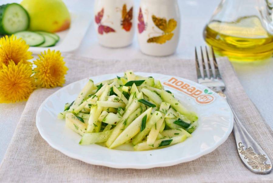 Весна — это не только яркие цветы, ароматы, но и пора отдыха на свежем воздухе. А это значит — шашлыки и салаты к мясу. Салат "Газапхули" ("Весна") из огурца, кисло-сладкого яблока и свежей зелени.