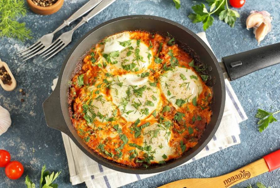 Когда масса станет однородной, вбейте в сковороду яйца по одному. Накройте сковороду крышкой и готовьте до готовности яиц. Лучше всего, чтобы желток остался немного жидким.