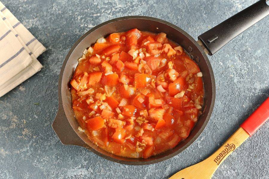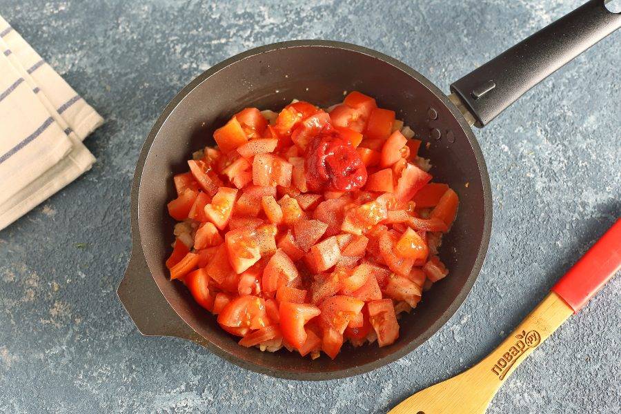 Затем добавьте нарезанные помидоры, томатную пасту, соль и молотый перец по вкусу. Можно добавить любимые специи.