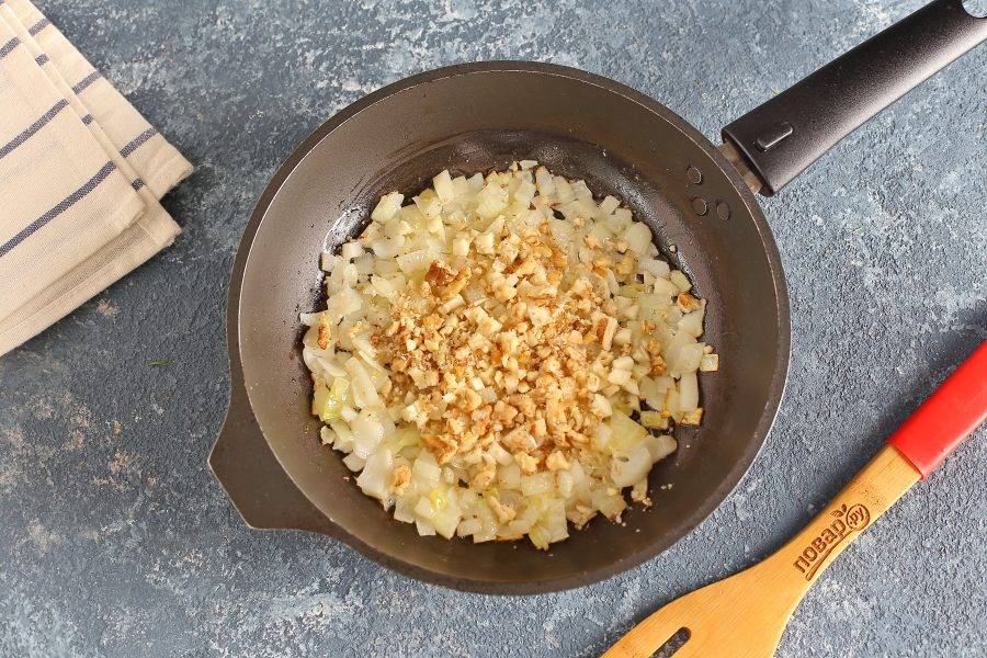 Добавьте измельченные орехи и чеснок. Обжарьте все вместе помешивая, еще одну минуту.