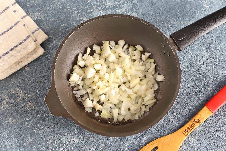 Прогрейте сковороду, добавьте растительное и сливочное масло. Выложите нарезанный кубиками лук и обжарьте его до мягкости.