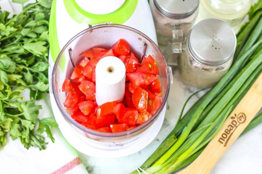 Промойте помидоры в воде, вырежьте сердцевинки из плодов и нарежьте томаты мелкими кубиками. Выложите нарезку в емкость блендера. Промойте и мелко нарежьте острый перец чили, удаляя семена, всыпьте в емкость блендера.