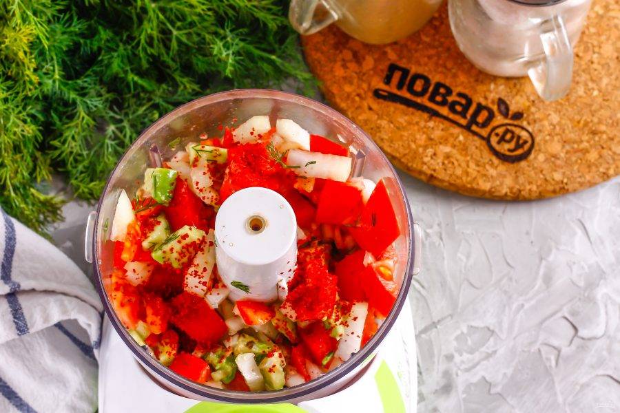 Выложите всю массу в чашу измельчителя или блендера. Всыпьте острый перец. Можно заменить его молотой паприкой.