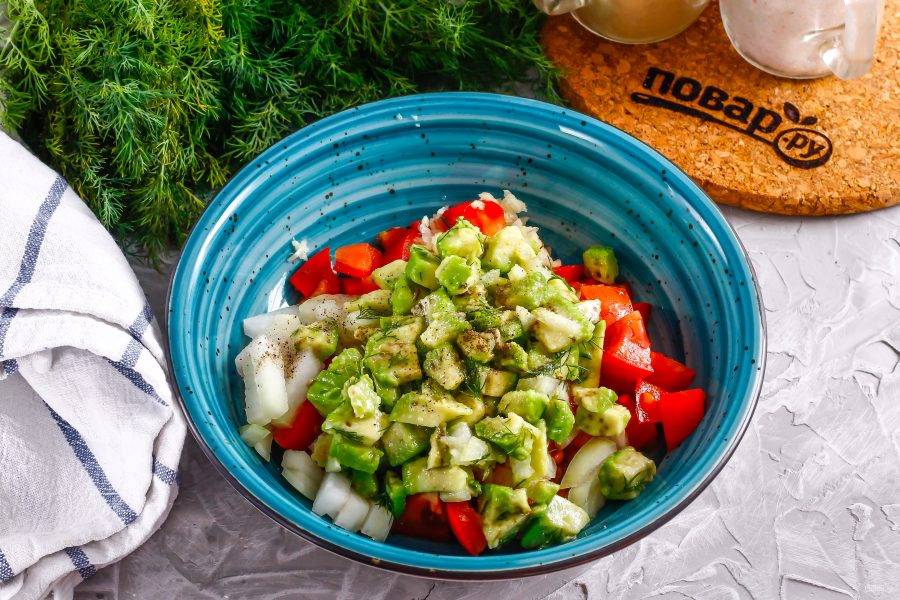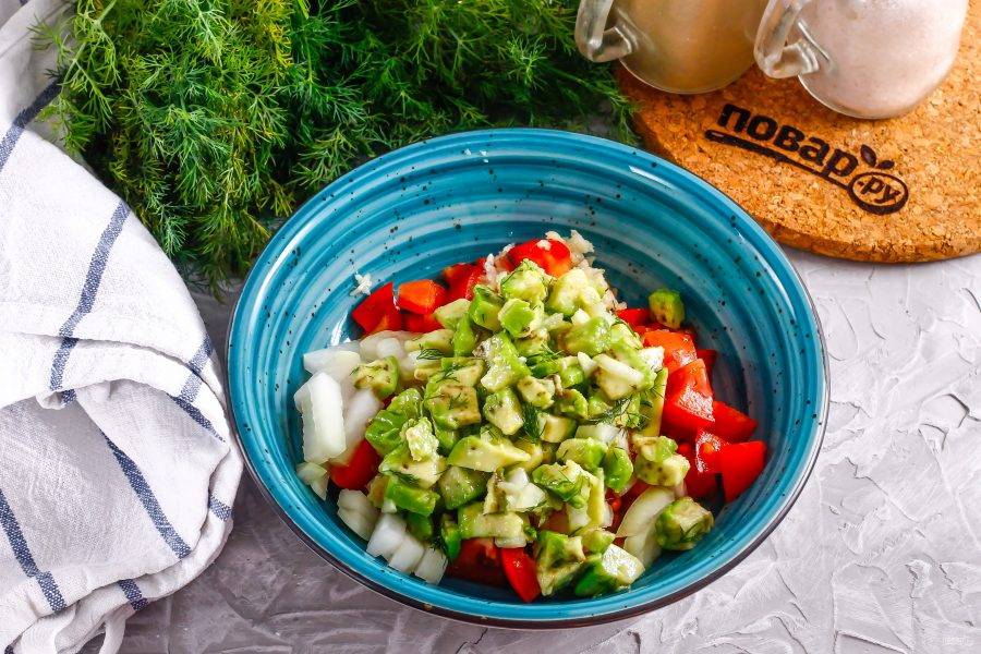 Разрежьте авокадо пополам, удалите косточку и очистите от кожуры. Нарежьте мякоть кубиками.