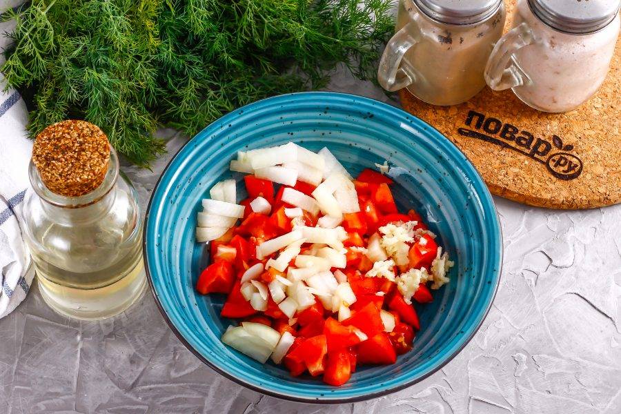 Очистите лук и чеснок от шелухи, промойте в воде. Нарежьте лук мелкими кубиками, а чеснок спрессуйте через специальный девайс.