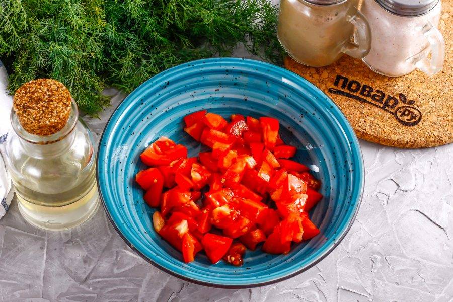 Промойте помидоры в воде, вырежьте зеленые сердцевинки и нарежьте кубиками, ломтиками.