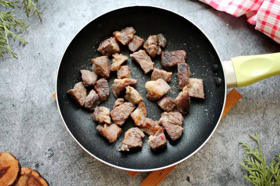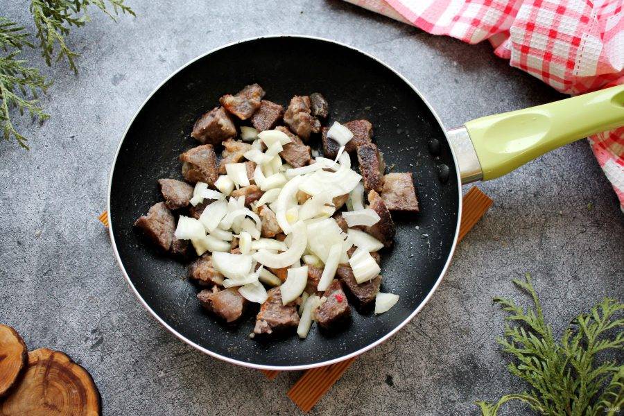 Репчатый лук порежьте и добавьте к мясу, перемешайте и обжаривайте на среднем огне в течение 5-7 минут.