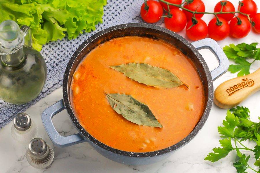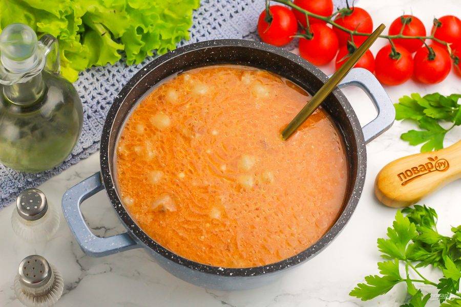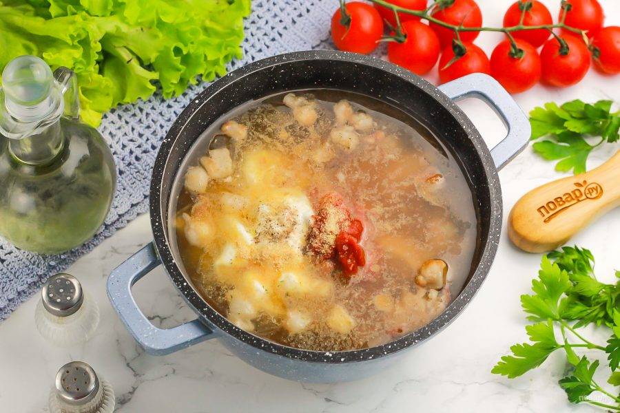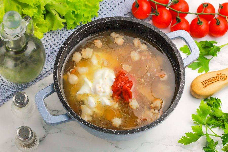 Добавьте сметану любой жирности и томатную пасту. Томатную пасту можно заменить томатным соком или мякотью томатов.