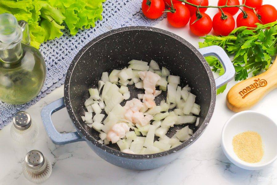 Очистите репчатый лук от кожуры и промойте в воде. Нарежьте мелкими кубиками и отпассеруйте в казане, в растительном масле примерно 3-4 минуты на среднем нагреве. Следите за луком — он быстро подгорает.