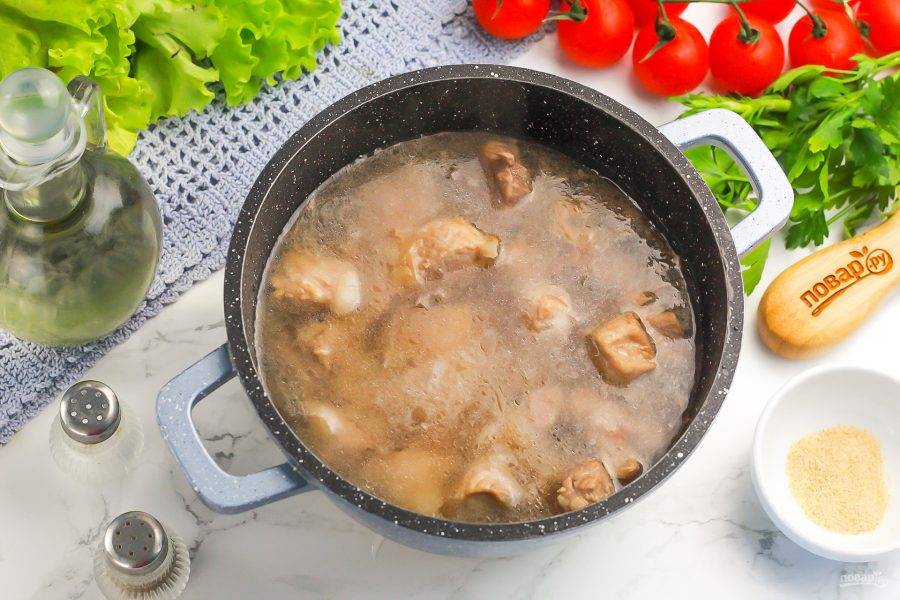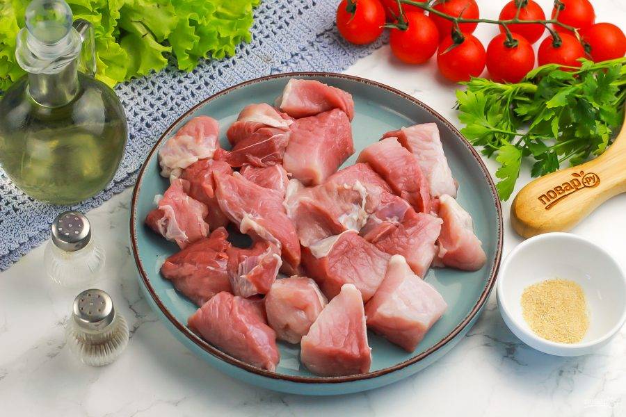 Свинину промойте в воде, обсушите бумажной салфеткой. Нарежьте мясо на порционные кусочки — средние кубики.