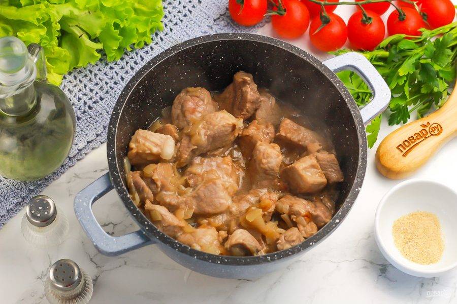 Добавьте свинину к луку и обжаривайте 15 минут, время от времени перемешивая. Сначала мясо выпустит сок и затем будет тушиться в нем.