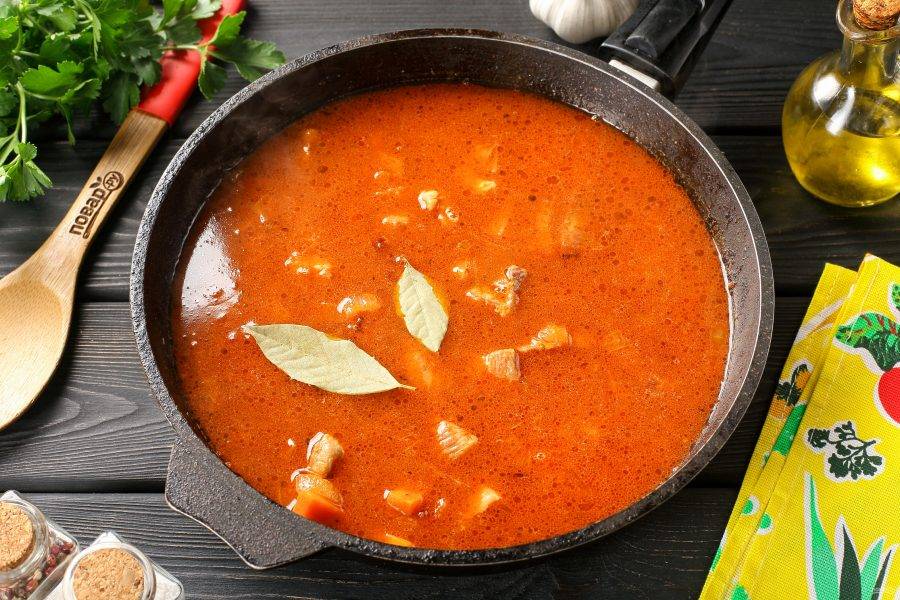 Тонкой струйкой влейте кипяток, добавьте лавровый лист и соль по вкусу.