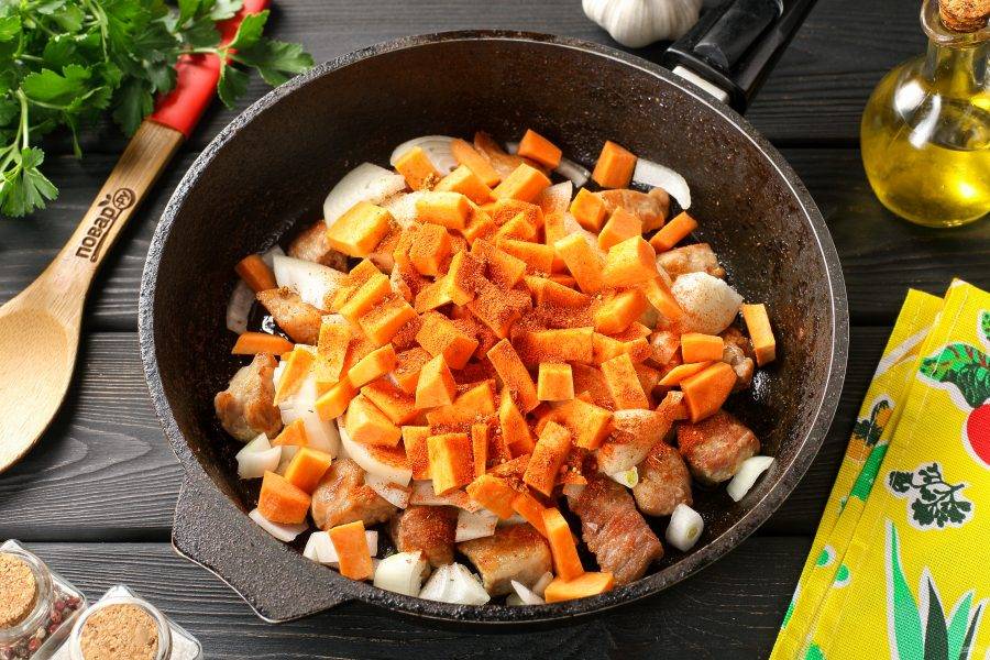 Затем добавьте нарезанный полукольцами лук и морковь, нарезанную небольшими брусочками. Так же добавьте паприку и любимые специи по вкусу.
