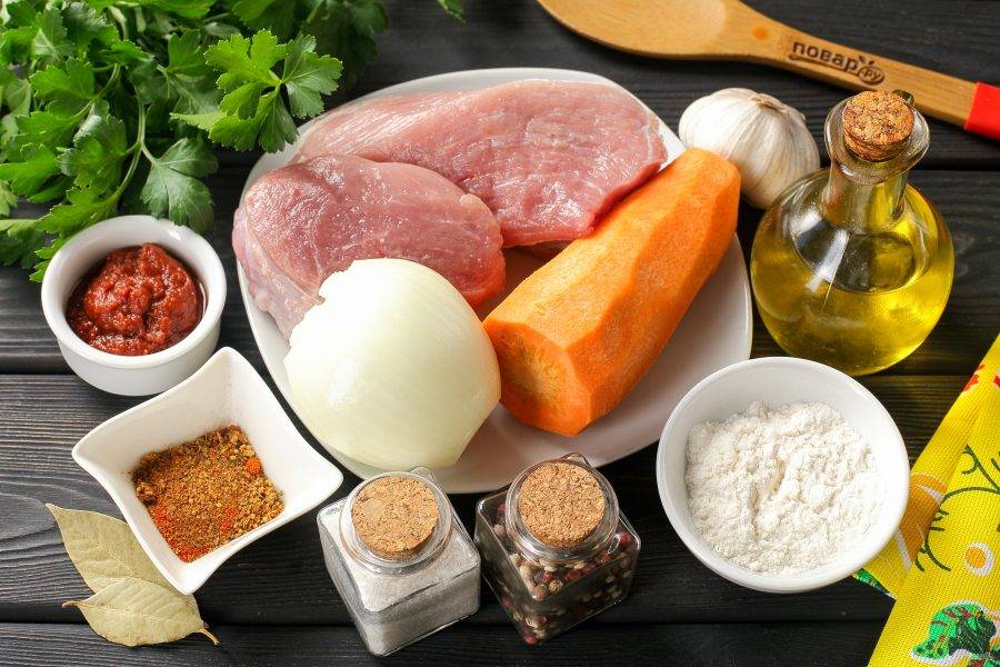 Подготовьте все ингредиенты по списку. Мясо промойте и обсушите бумажным полотенцем. Соль и специи берите на свой вкус. Лук и морковь очистите и ополосните.