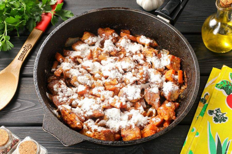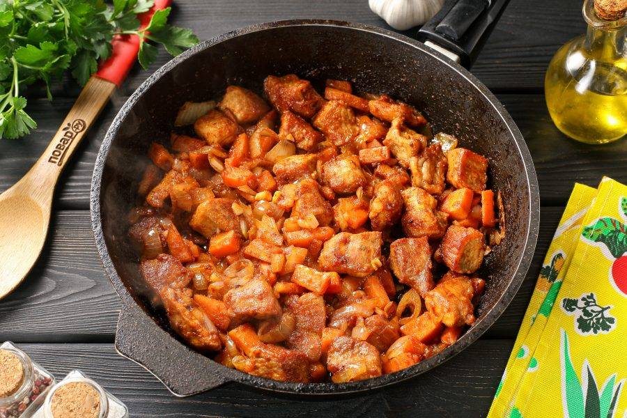 Перемешайте, накройте крышкой и тушите на маленьком огне около 45 минут (до готовности мяса).