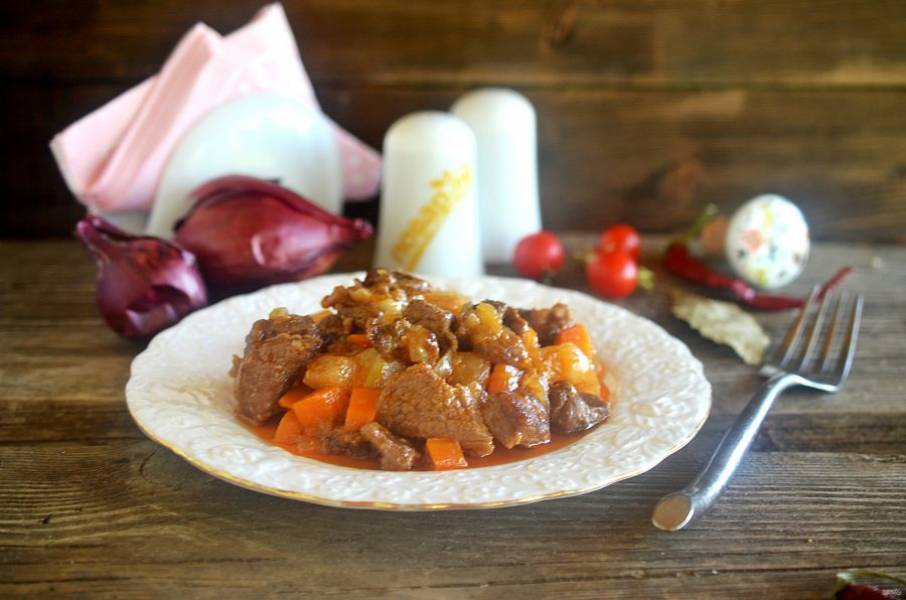 Рецепт приготовления тушеной говядины с пивом, паприкой, луком, чесноком, морковью и картофелем.