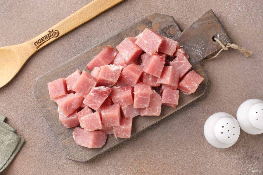 Мясо нарежьте небольшими кубиками.
