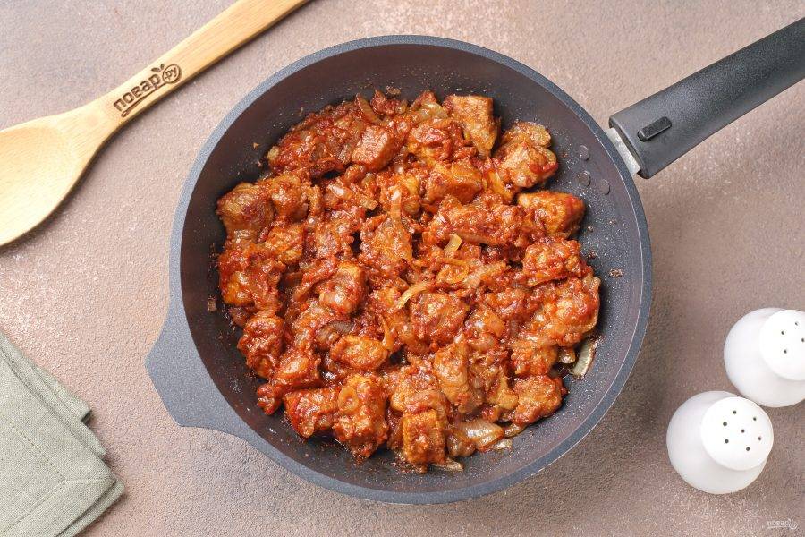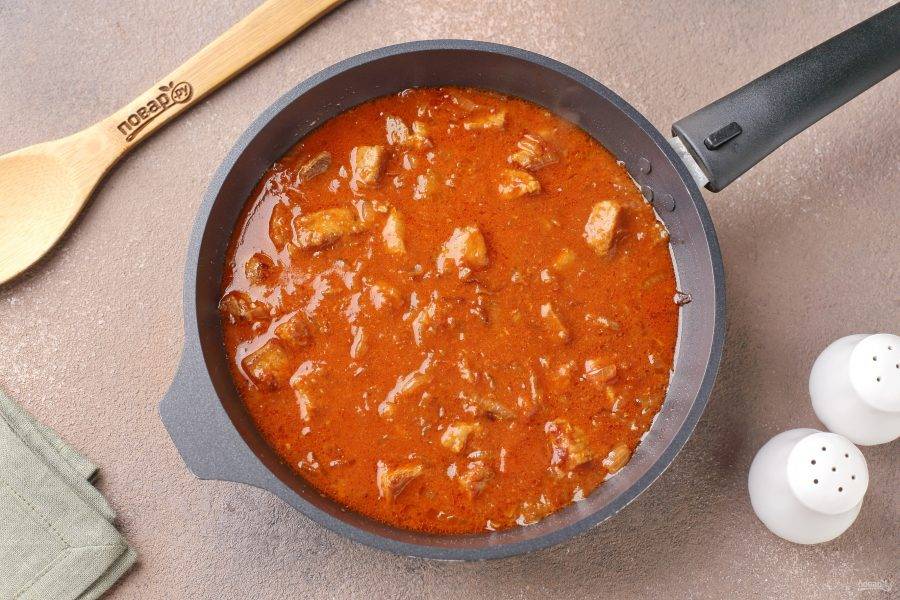 Влейте кипяток. Количество воды добавляйте на свой вкус, всё зависит от того, какое количество соуса вы хотите получить. У меня ушло примерно 2 стакана. Накройте сковороду крышкой и тушите на небольшом огне 30-40 минут.