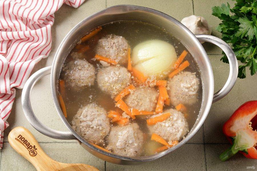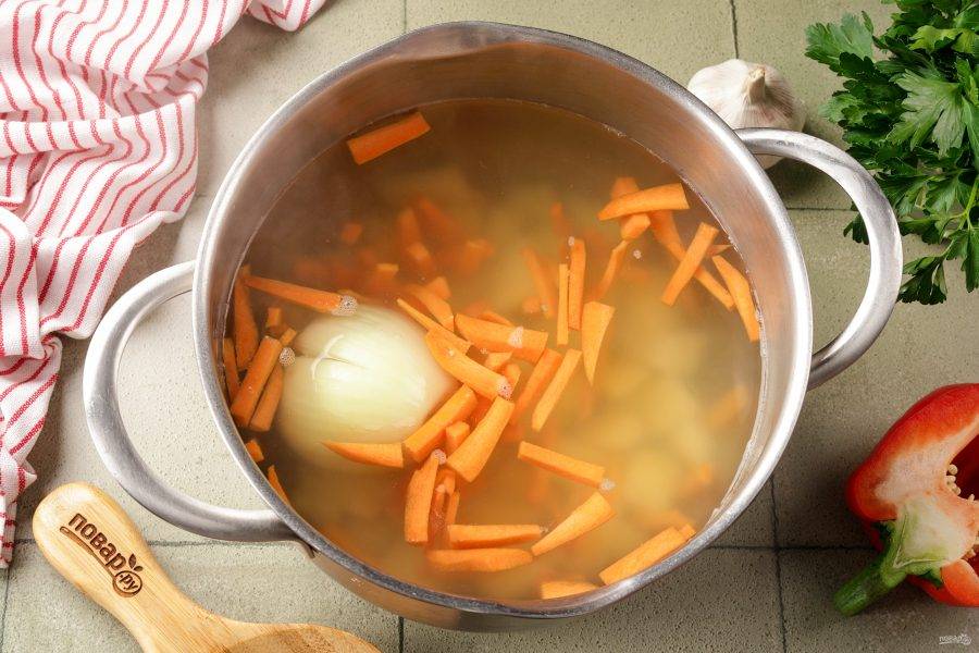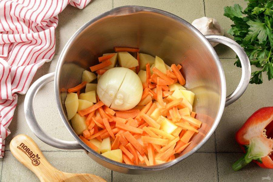 Картофель нарежьте кубиками и переложите в кастрюлю, добавьте нарезанную соломкой морковь и очищенную луковицу, сделав в ней ножом надрезы.