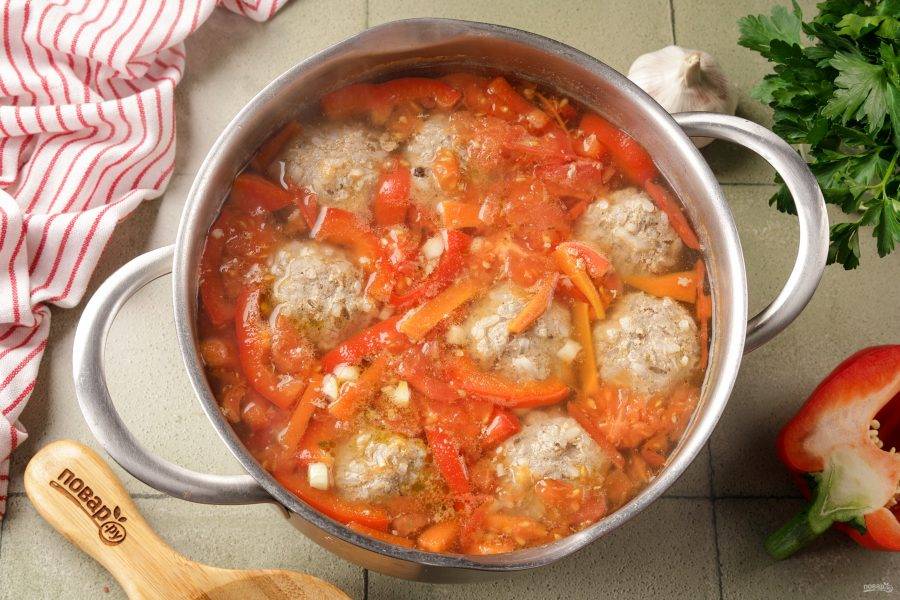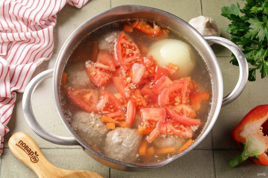 За 10 минут до готовности добавьте нарезанные помидоры и перец. Отрегулируйте на соль.