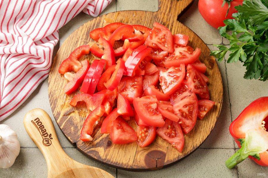 Помидоры нарежьте небольшими дольками, болгарский перец некрупной соломкой.
