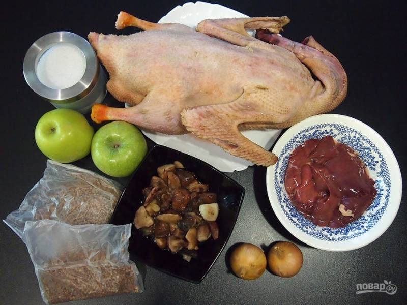 Для начала выложите и подготовьте все необходимые ингредиенты. У меня гусь жирненький, деревенский. Если у вас такого нет, берите магазинного. Обмойте птицу. Отрежьте у неё гузку, уберите жир. После чего опять помойте и обсушите птицу. По поводу грибов: в принципе можно брать любые. Печень советую брать гусиную, однако можно использовать и куриную.