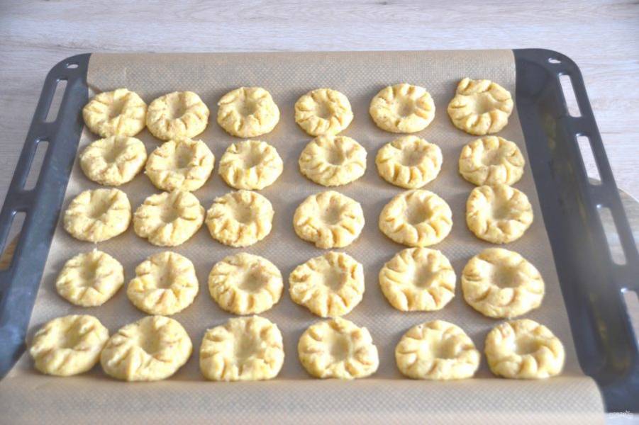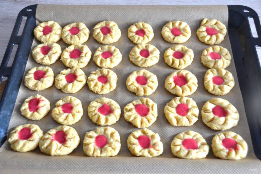 Чайной ложкой аккуратно разложите начинку в центр печенья. Разогрейте духовку до 160 градусов, выпекайте печенье 20-25 минут.
