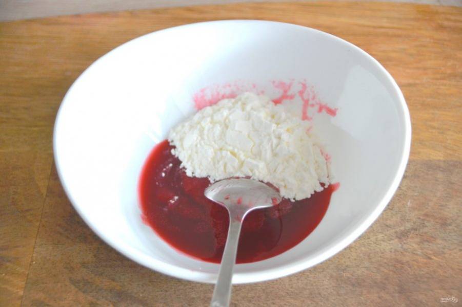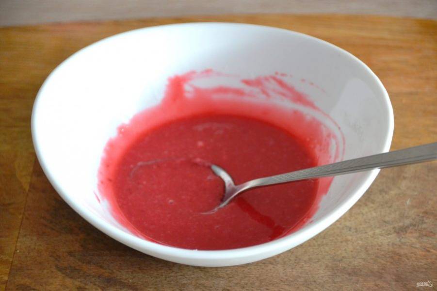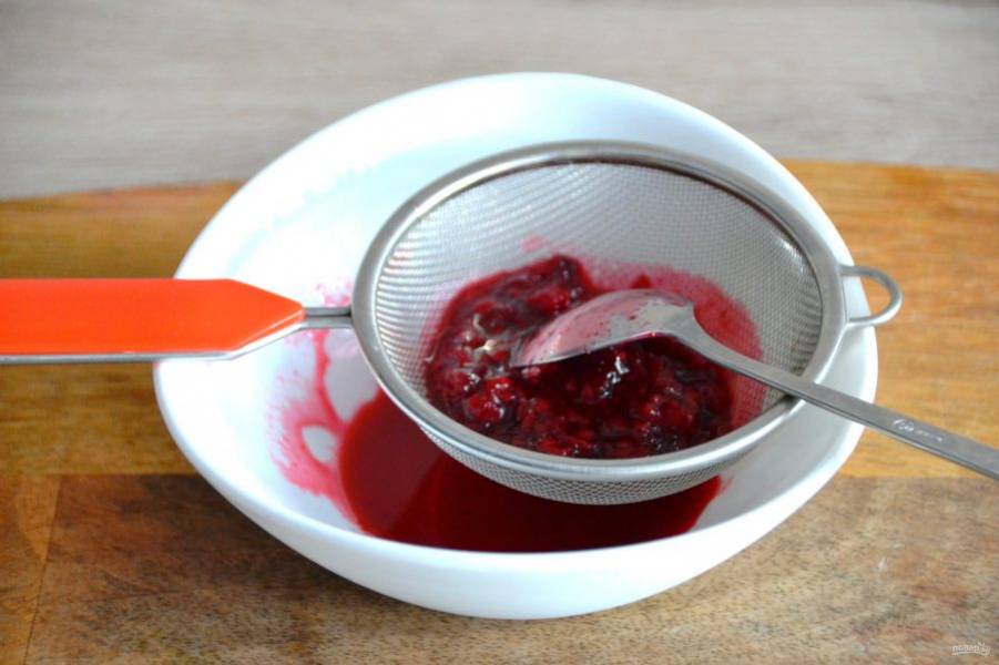 Подготовьте начинку для печенья, для этого протрите через сито малиновое варенье.