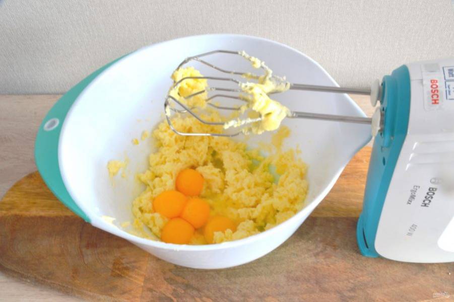 Добавьте к взбитому маслу цедру, сок одного лимона, 4 желтка и одно целое яйцо, еще раз взбейте.