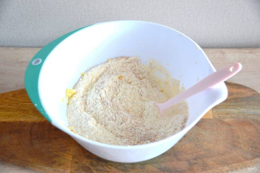 Всыпьте смесь муки и измельченного миндаля (или миндальную муку), добавьте щепотку соли.