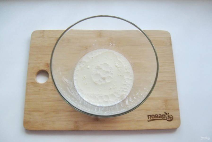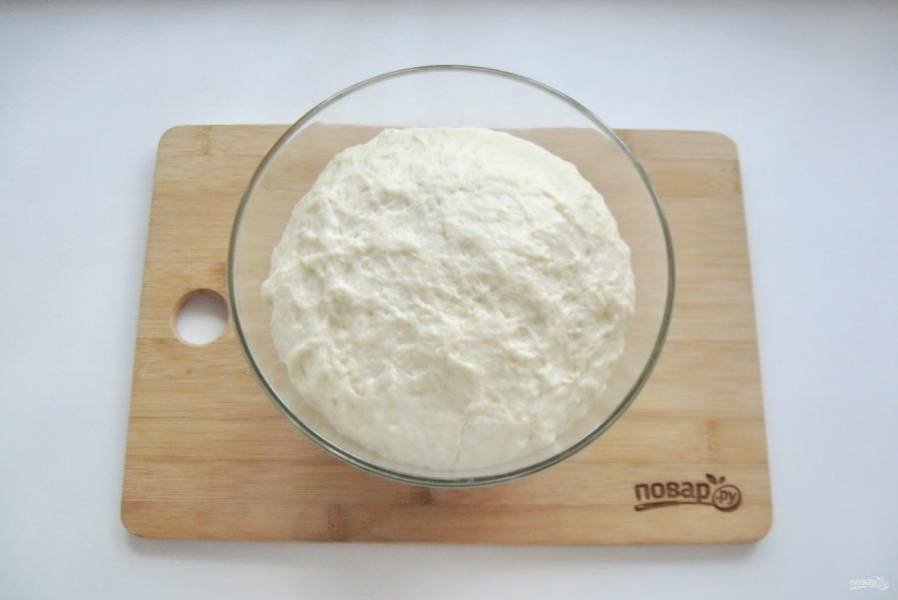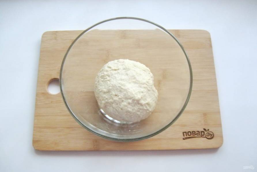 Накройте миску с тестом пищевой пленкой и поставьте в теплое место для увеличения в объеме.