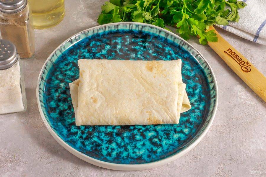 Аккуратно сверните края лаваша, чтобы начинка не смогла просочиться при жарке. Затем закатайте его в рулетик или сверните в виде прямоугольника.