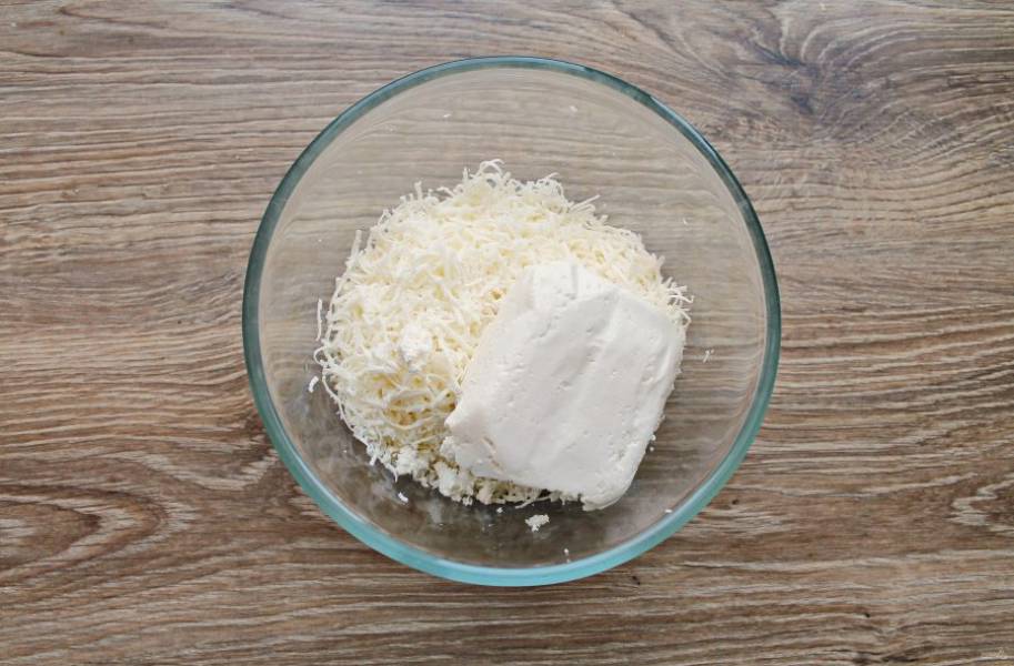 Сулугуни натрите на средней терке и выложите в миску.