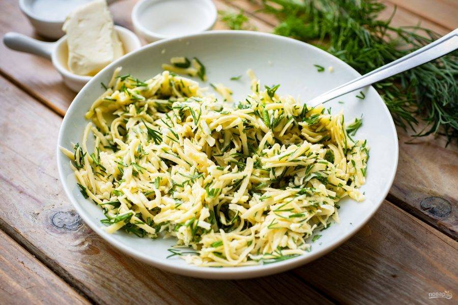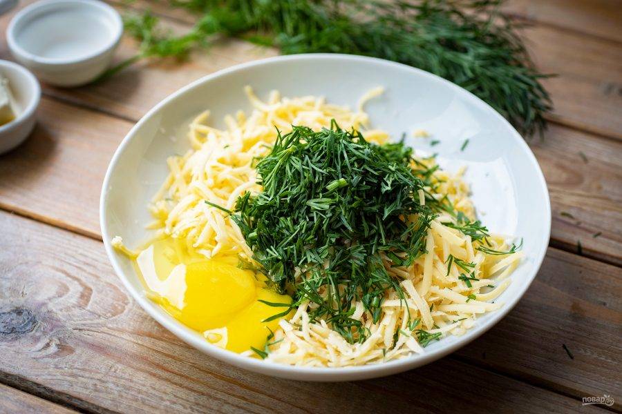 В просторную миску натрите твердый сыр, добавьте мелко порубленный укроп, вбейте яйцо.