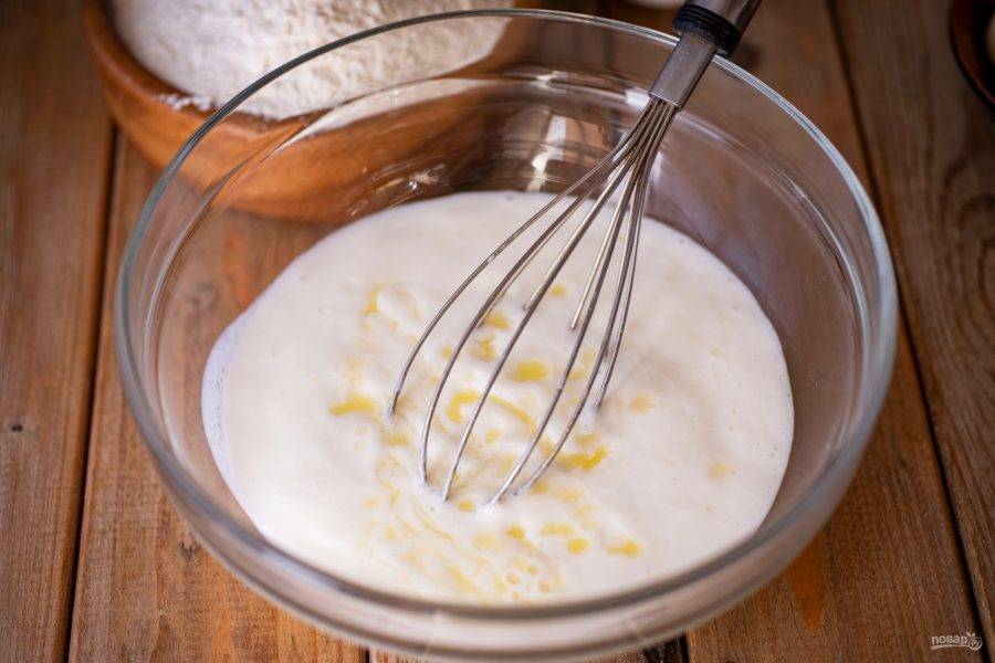 Залейте сливочное масло, растопленное в сотейнике на маленьком огне. Перемешайте венчиком.