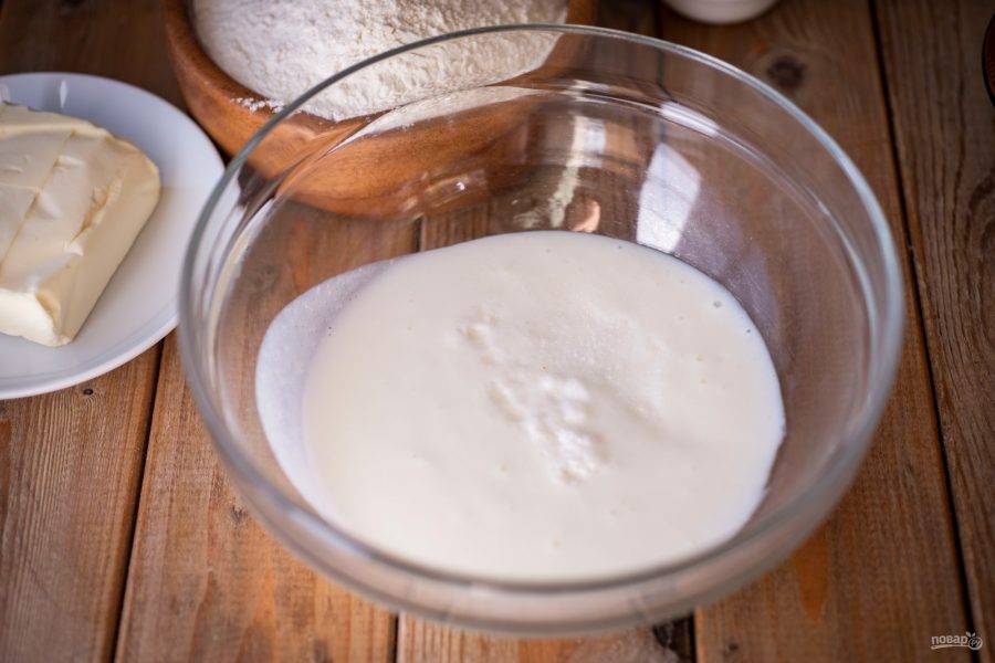 В просторную миску залейте кефир, добавьте соду, соль. Перемешайте.