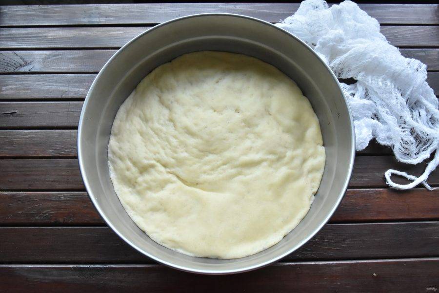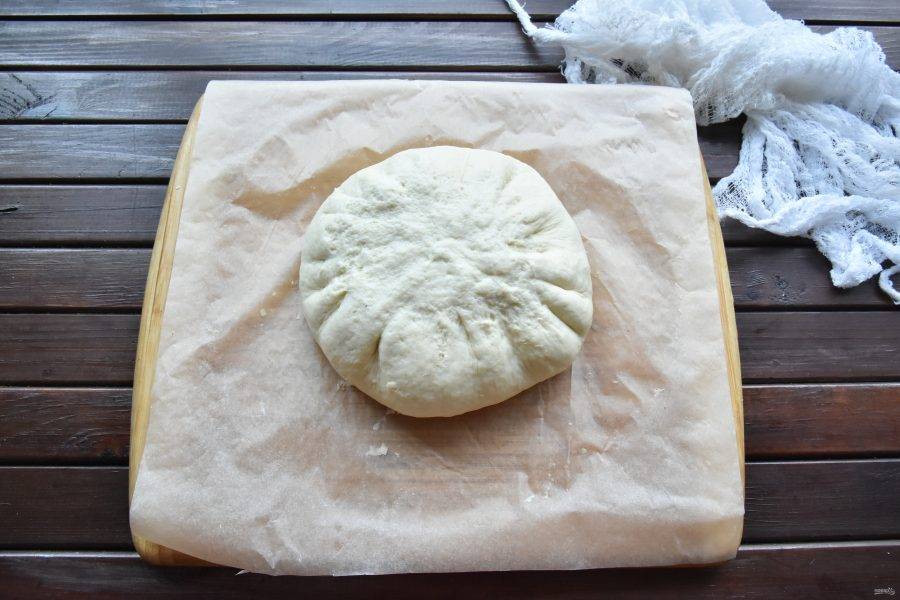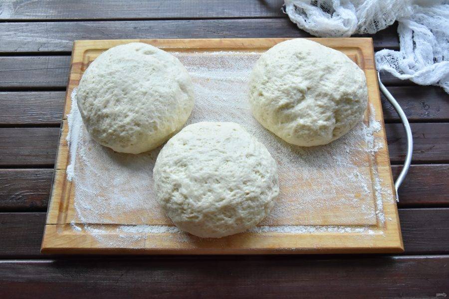 Готовое тесто разделите на три части, весом примерно по 300 граммов. Заготовки округлите и выложите на доску, припыленную мукой. Сверху тесто накройте кухонным полотенцем, чтобы не подсыхало.