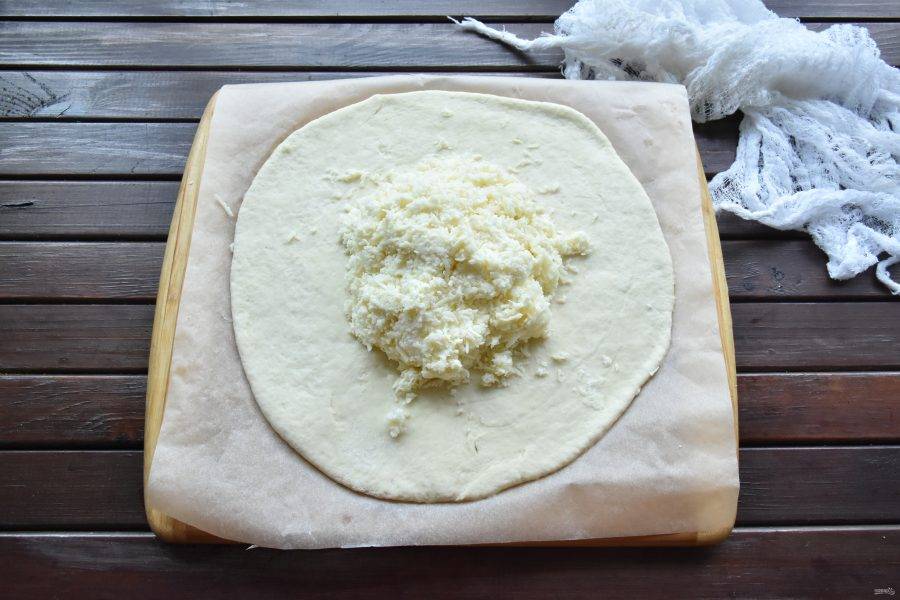 Заготовку из теста раскатайте в лепешку. На середину лепешки выложите часть сырной начинки.
