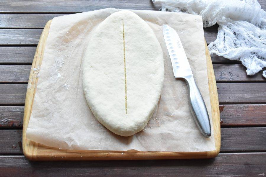 Переверните шар из теста с сырной начинкой, швом вниз. Раскатайте, придавая овальную форму лепешке. По середине "лодочки" острым ножом сделайте разрез.