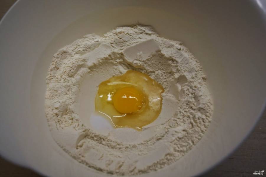 В миску просейте муку, добавьте соду, вбейте яйцо.